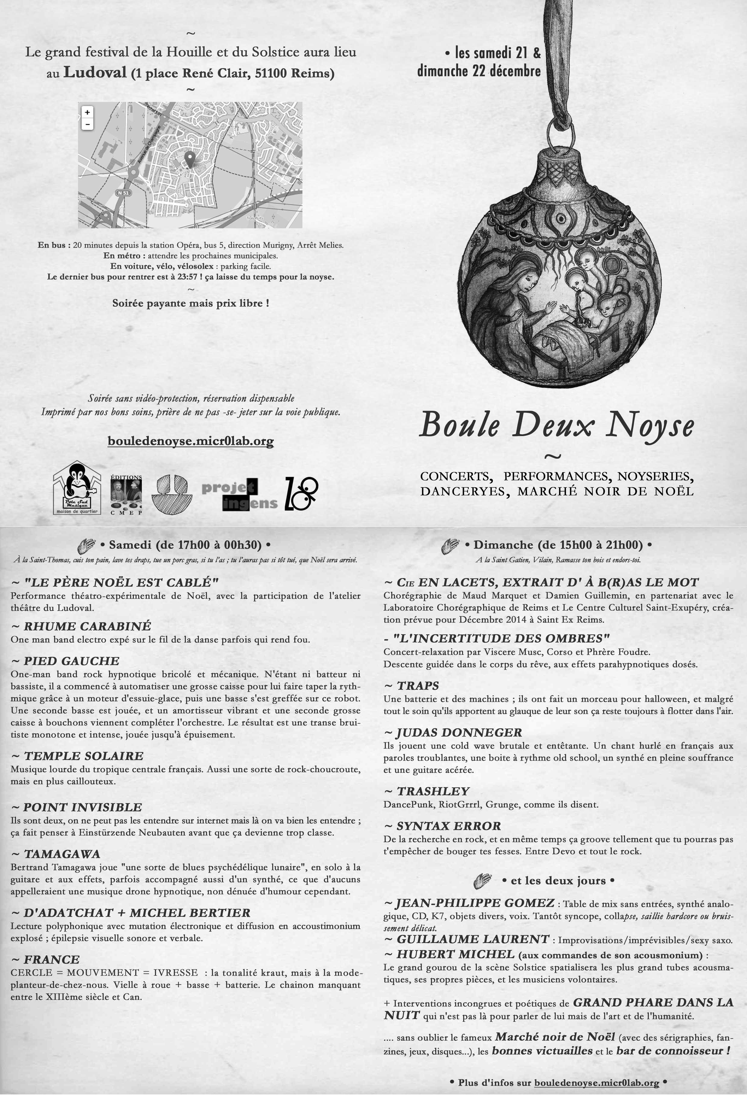 | 23h30~00h | D'adatchat & Michel BertierLecture polyphonique, mutation électronique, diffusion en accoustimonium : ça va pêter |